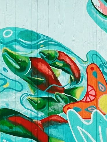 Commissioned by the City of Redding to beautify a new open space area in Redding, this mural highlights the local species or Chinook Salmon that spawns in the river right in view every season. The name Nur Pon means Salmon Run in the Winnemen Wintu Language who originally inhabited the land.